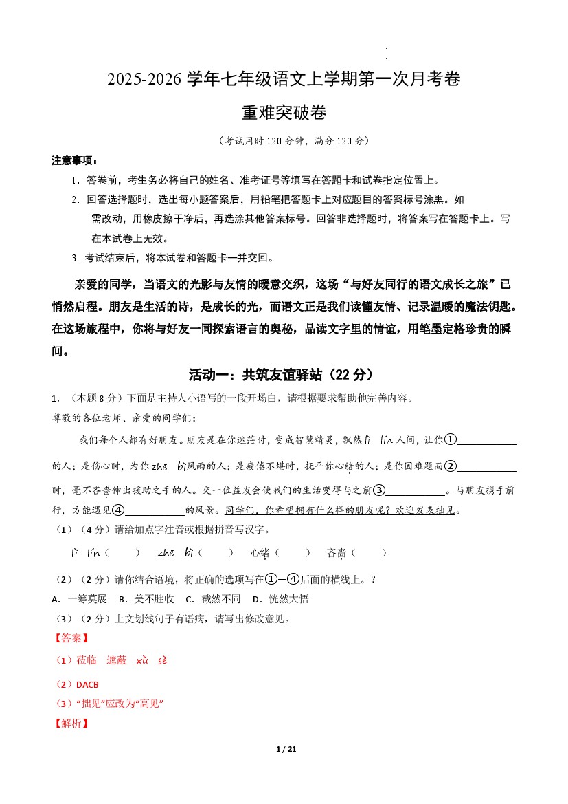 七年级语文第一次月考卷·重难突破卷(全解全析)
