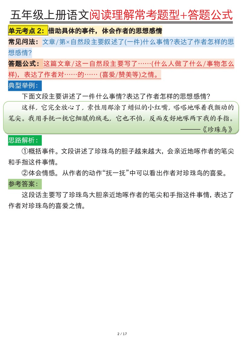 小学 五年级上册语文阅读理解常考题型+答题公式输出