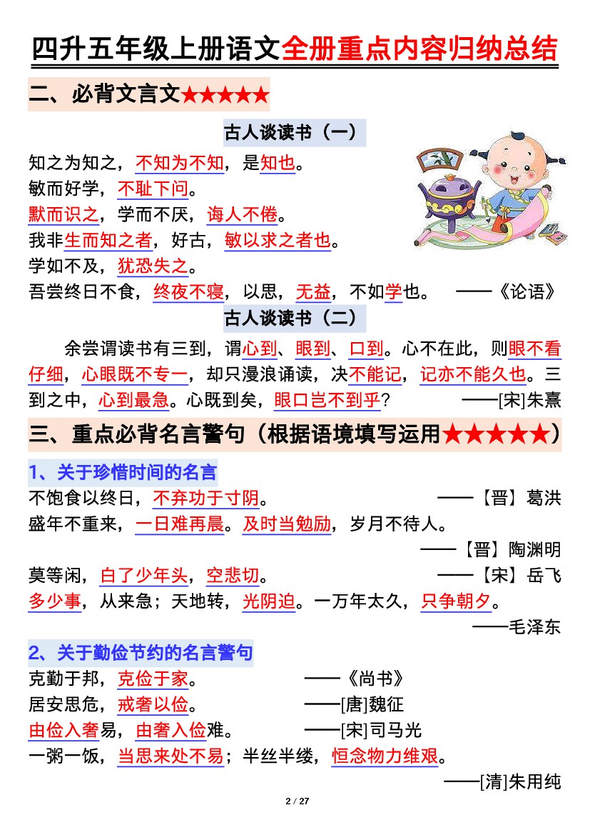 小学 四升五年级上册语文全册重点内容归纳总结输出27页