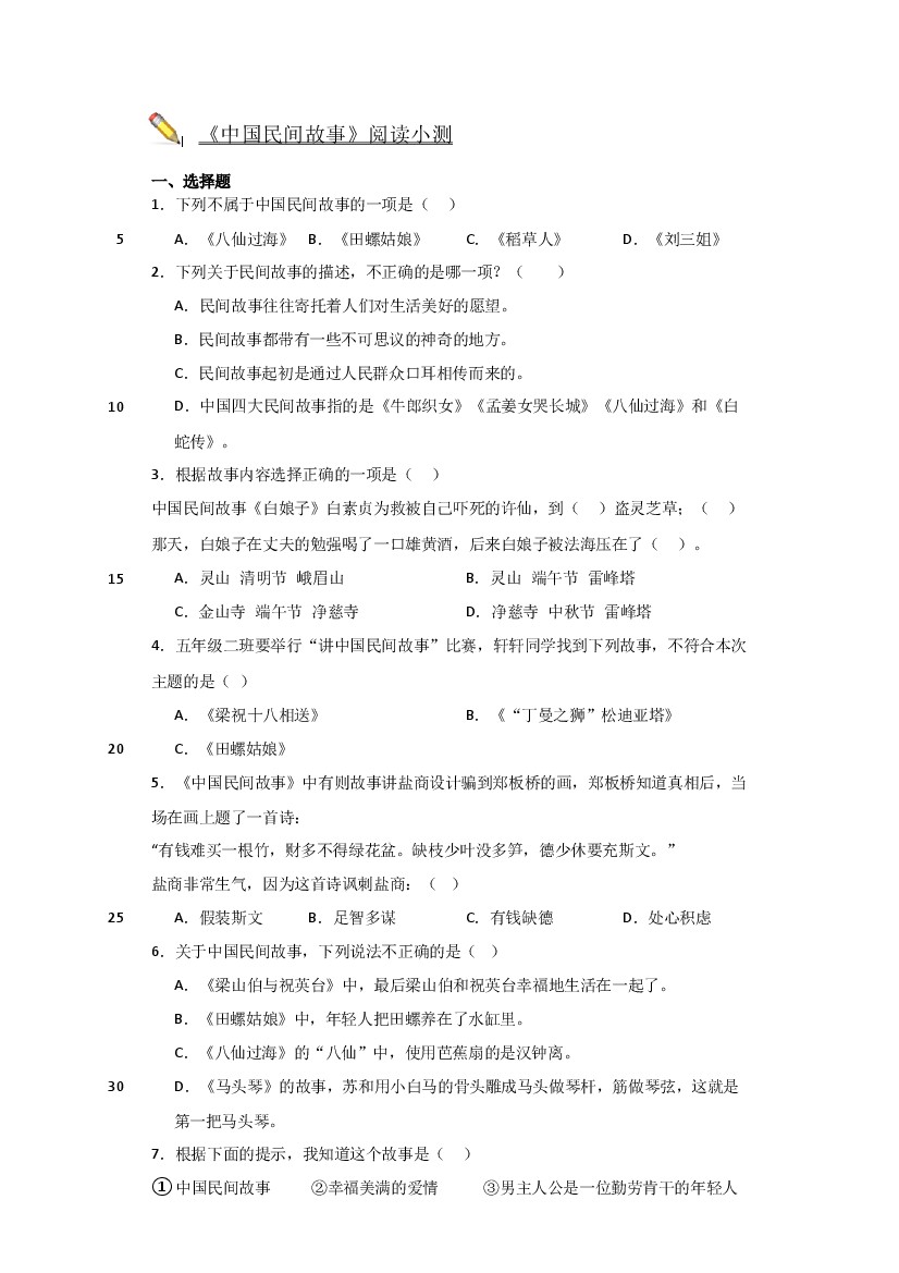 快乐读书吧:中国民间故事(专项训练)-2023-2024学年五年级语文上册(统编版)