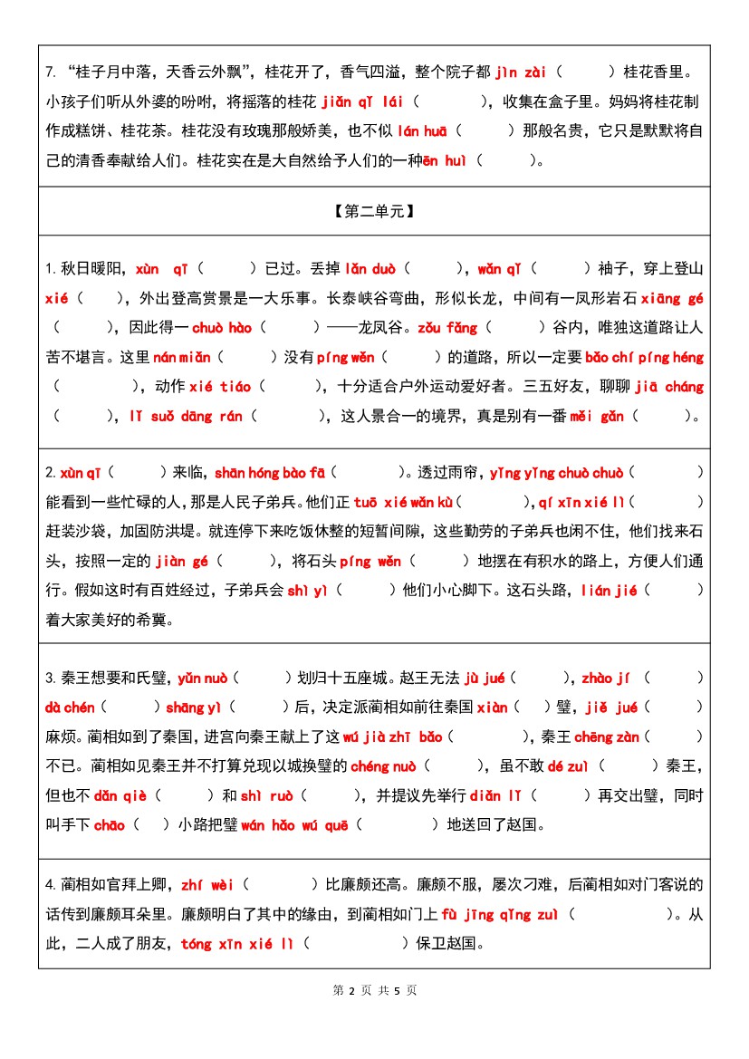 五年级(上)语文 期中复习情景默写1-4单元