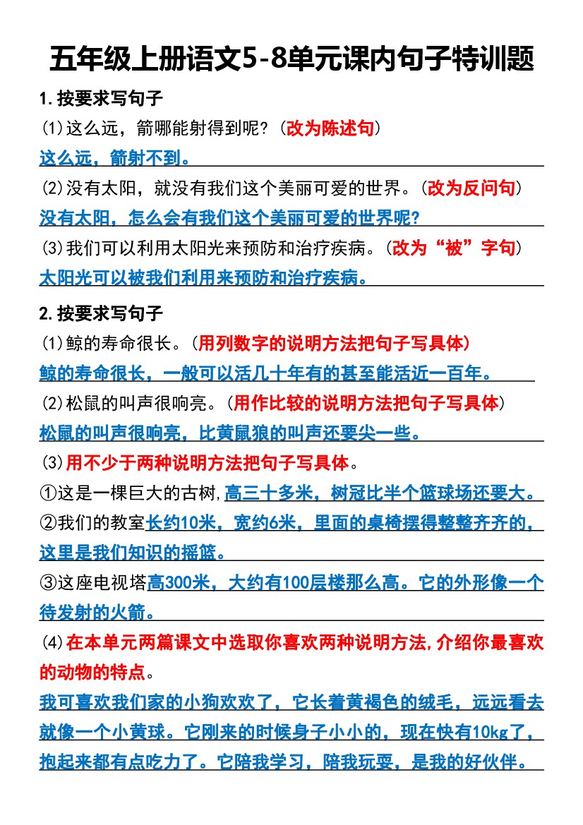 五年级上册语文5-8单元课内句子特训题