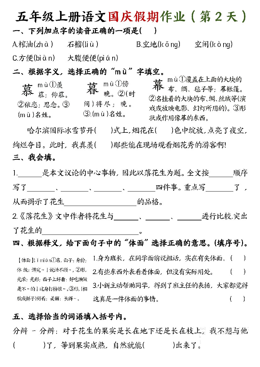 首页 > 全部 > 专项练习 > 五年级上册语文国庆假期作业每天一练7页