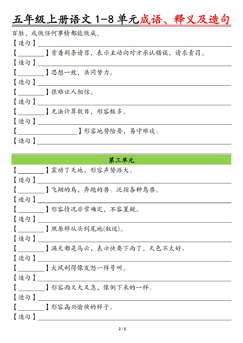 小学 五年级上册语文1-8单元成语、释义及造句(空白版)