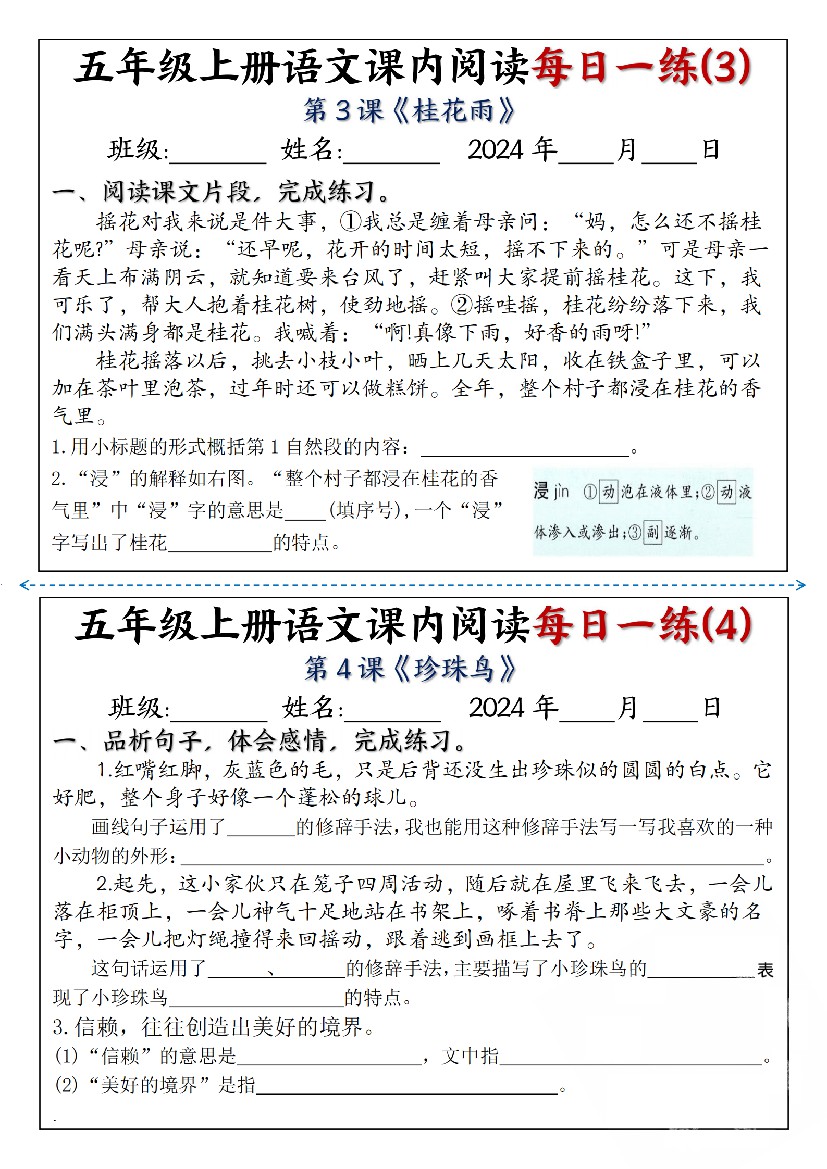 小学 五年级上册语文课内阅读每日一练(含答案17页)