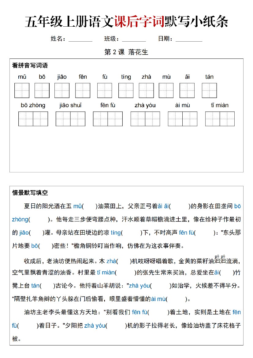 小学 五上语文课后字词默写小纸条(含答案26页)