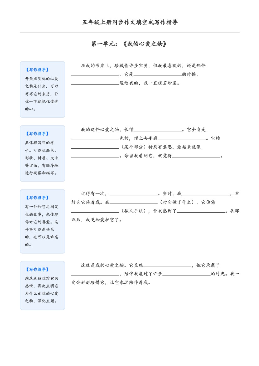 小学 五年级上册语文同步作文填空式写作指导(空白版)