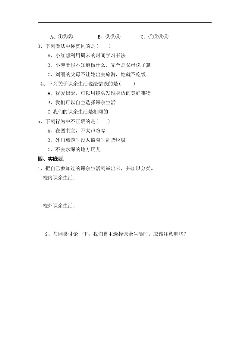 【一课一练】第一课 自主选择课余生活 五年级上册道德与法治 人教部编版(含答案)