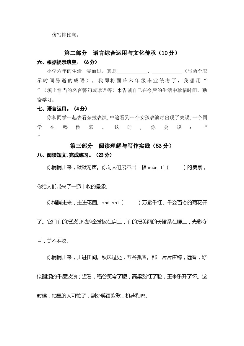 小学 25年秋六上语文第一单元语文素养评估