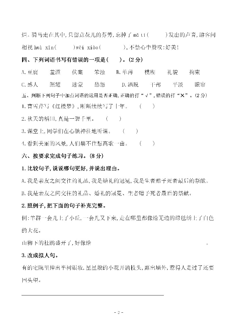 首页 > 全部 > 单元测试 > 六(上)语文第一单元检测试卷(二)
