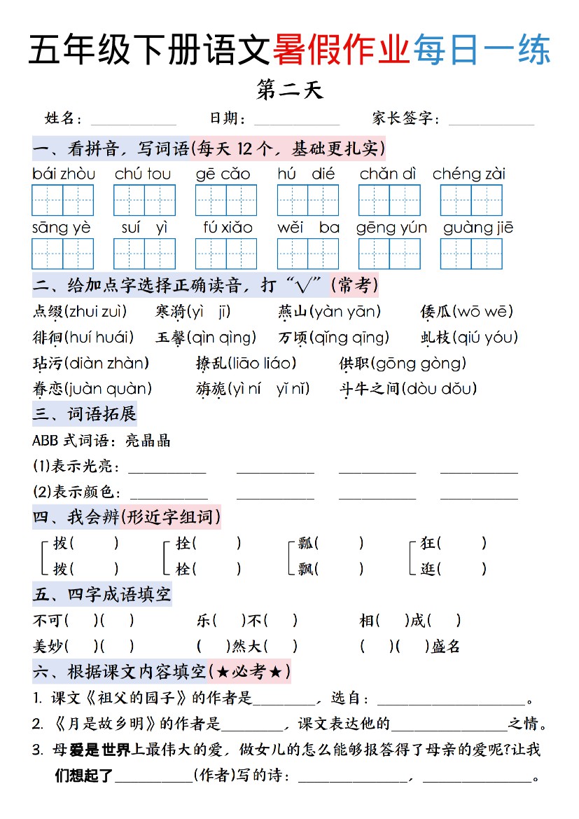 五升六年级下册语文暑假作业每日一练(含答案23页)