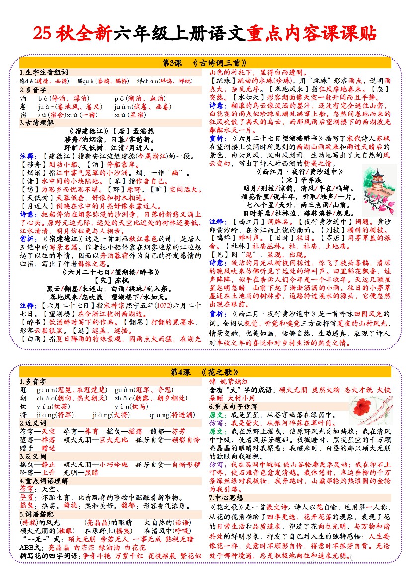 25秋全新六年级上册语文重点内容课课贴(18页)