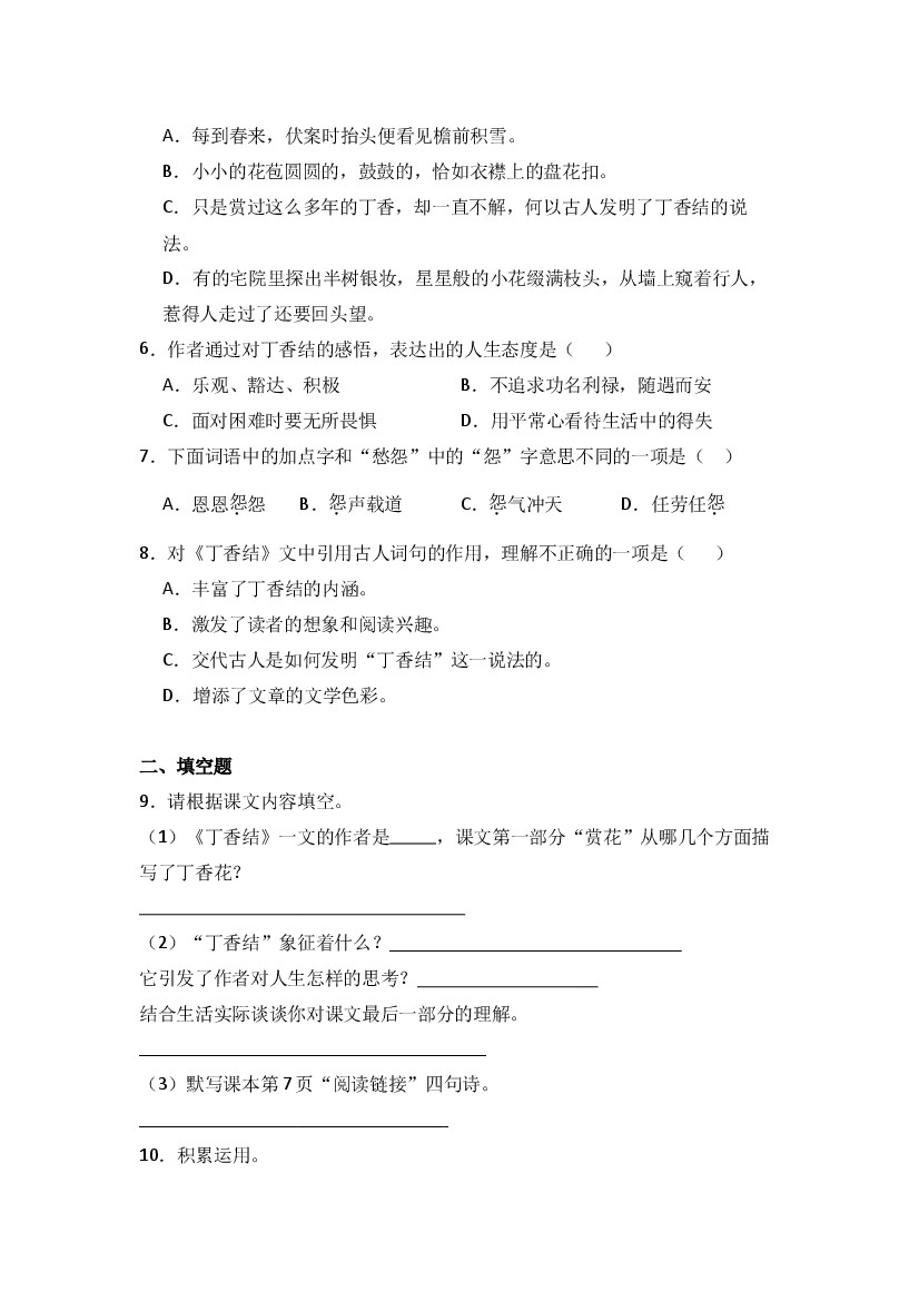 首页 > 全部 > 课时练习 > 2 丁香结 -语文六年级上册(统编版)