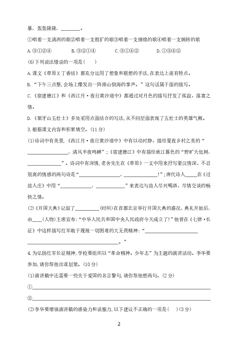 六年级上册语文第1-2单元月考阶段测试(附答案7页)