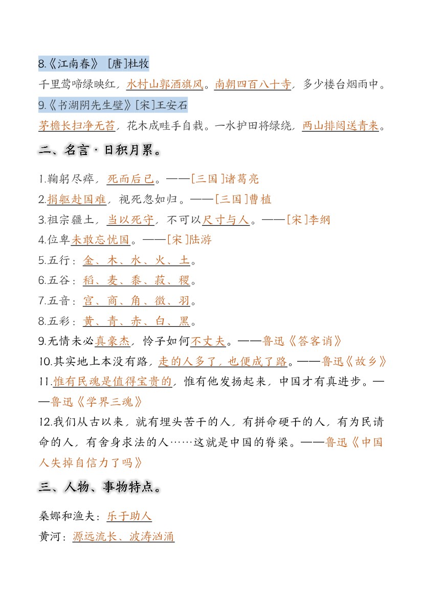 【暑假】六年级语文上册全册重要知识点汇总(10页暑假预习必背古诗、名言、课文)