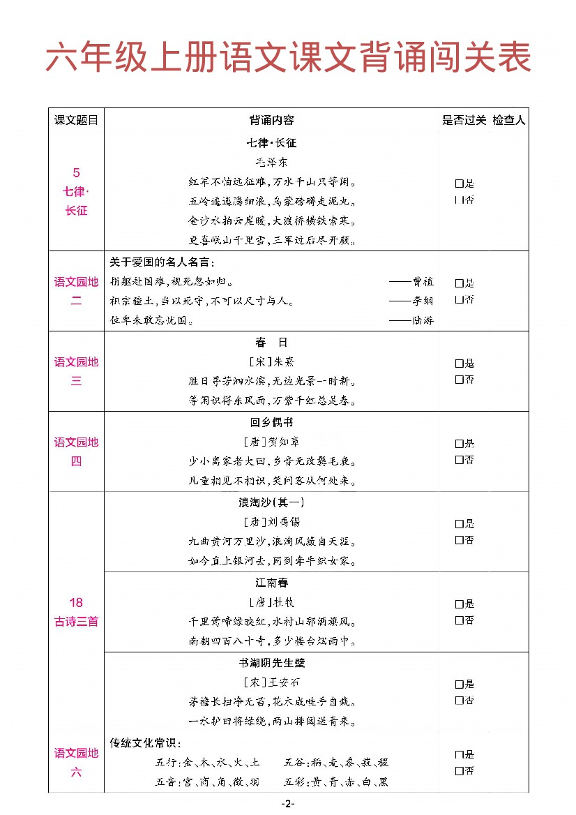 六年级(上)语文课文背诵闯关表