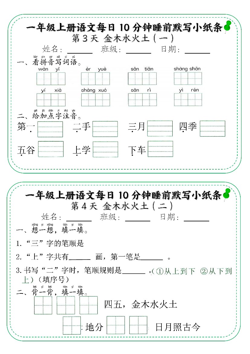 小学 一年级(上)语文 每日10分钟睡前默写小纸条1