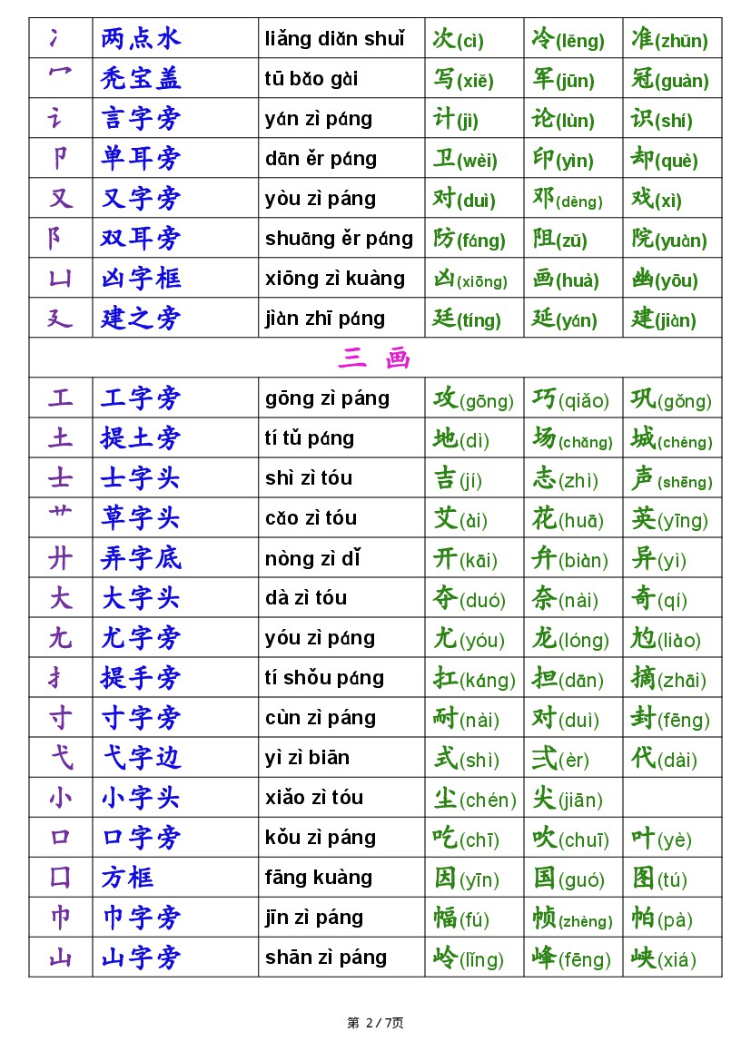 小学 一年级上册语文汉字偏旁部首名称表(7页)