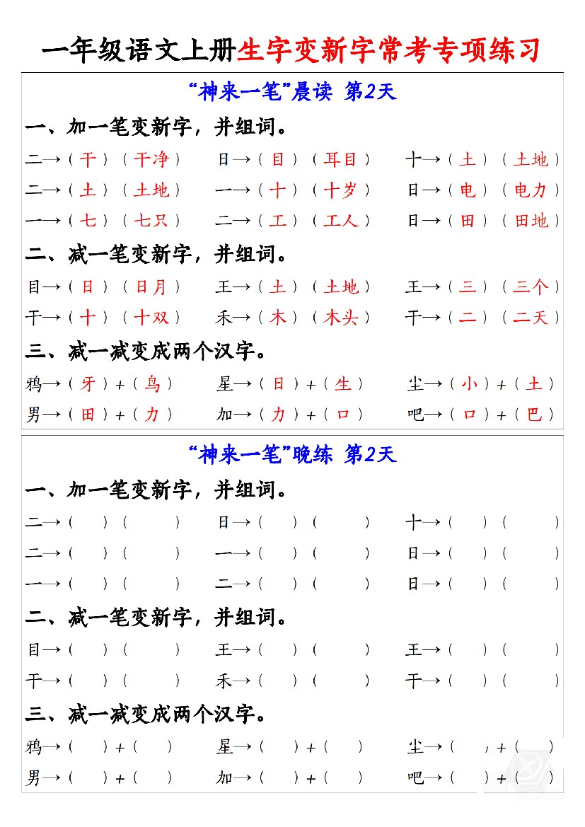 小学 新一上语文生字变新字常考专项练习(晨读晚练9天)9页