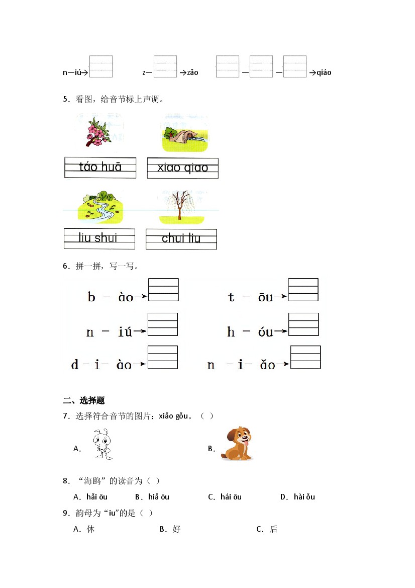 小学 11 ao ou iu 同步分层作业-一年级上册语文(统编版)
