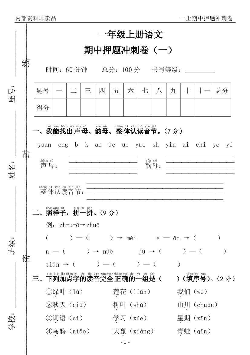 小学 一上语文期中押题冲刺卷5套(含答案25页)