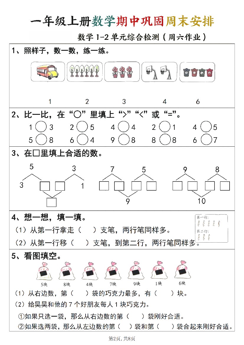 小学 一年级上册语文数学期中巩固空白+答案周末安排