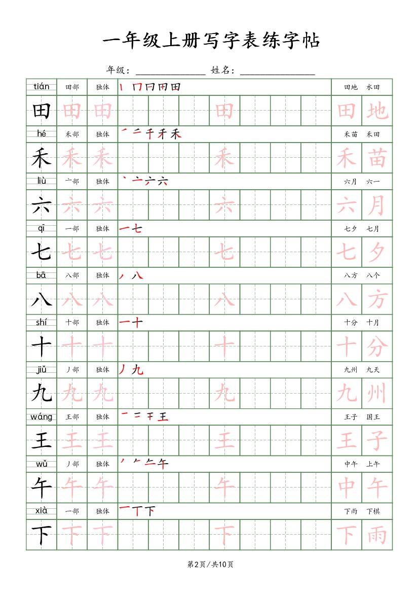 首页 > 全部 > 生字字帖 > 新版一上语文写字表练字贴(10页)楷体