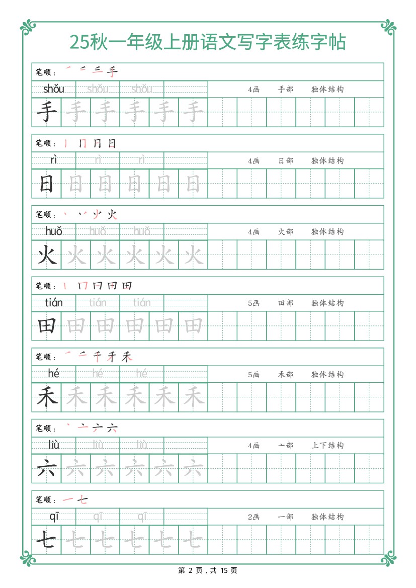 小学 25秋一年级上册语文写字表练字帖(15页)