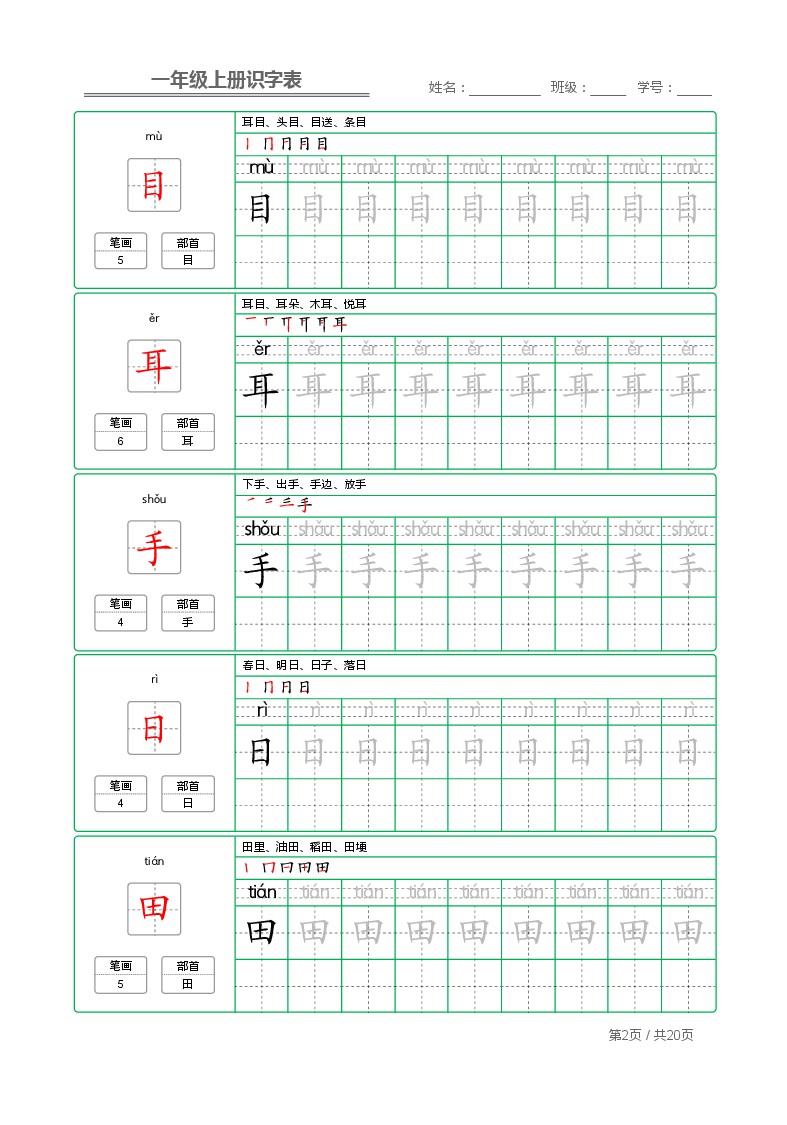 首页 > 全部 > 生字字帖 > 一上写字表 字帖描红