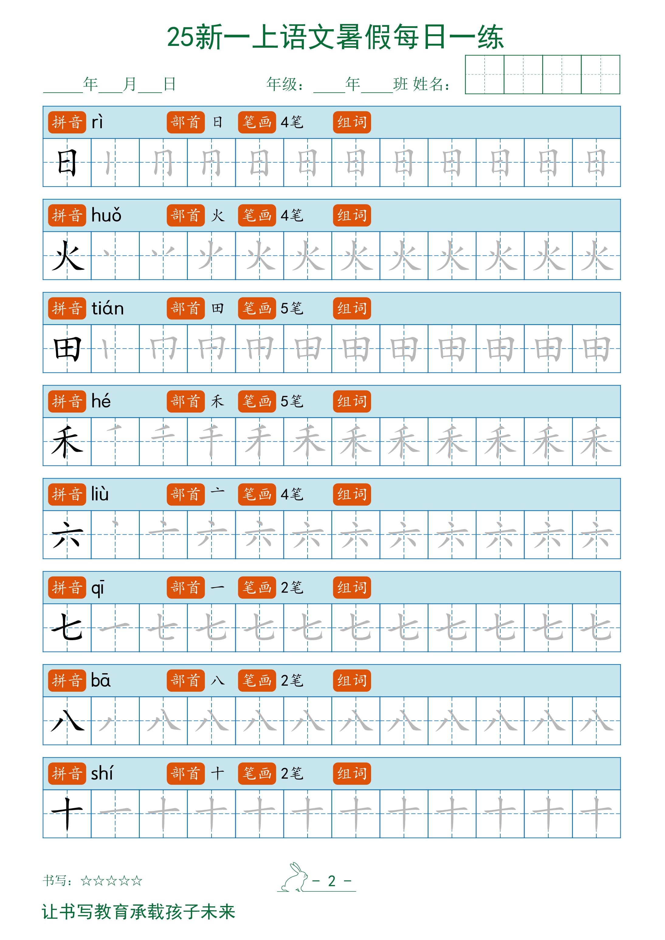 首页 > 全部 > 生字字帖 > 2025秋新一上语文暑假每日一练字帖