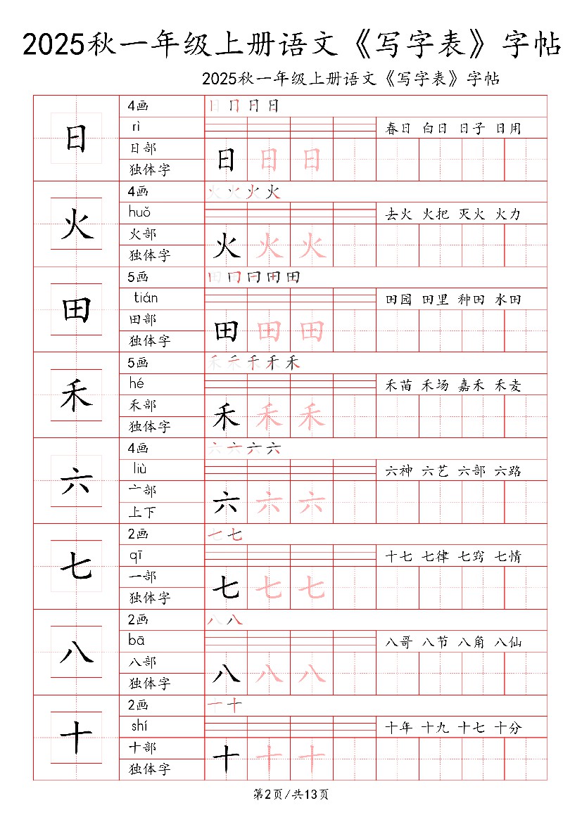 首页 > 全部 > 生字字帖 > 一上语文【2025秋一《写字表》一类字字帖】