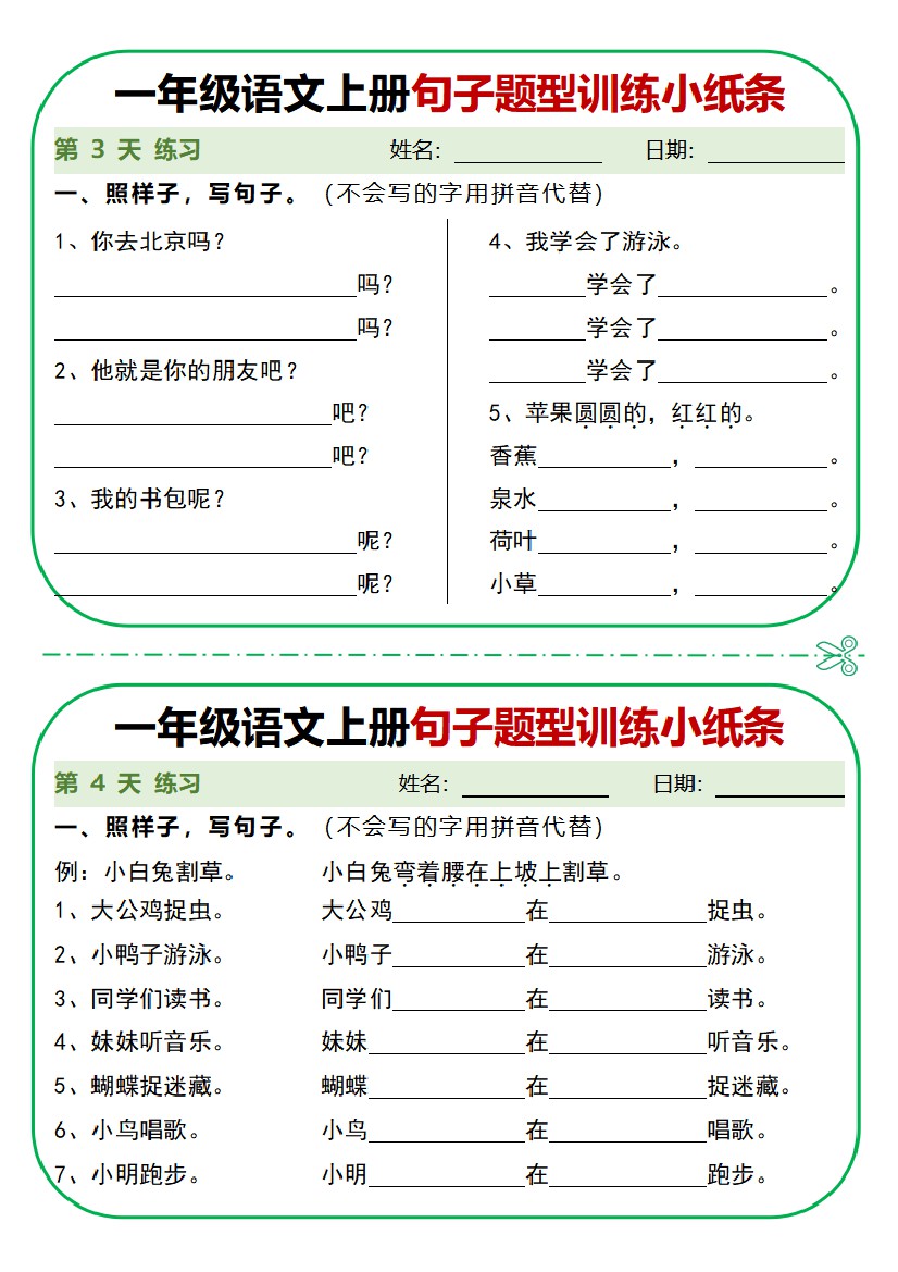 首页 > 全部 > 语句专项 > 一上|语文 句子题型训练小纸条