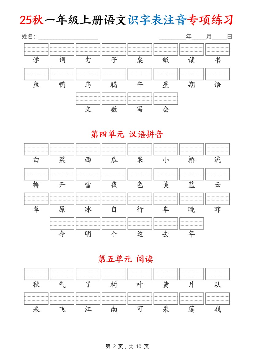 小学 【25秋一上语文识字表注音专项练习(含答案10页)