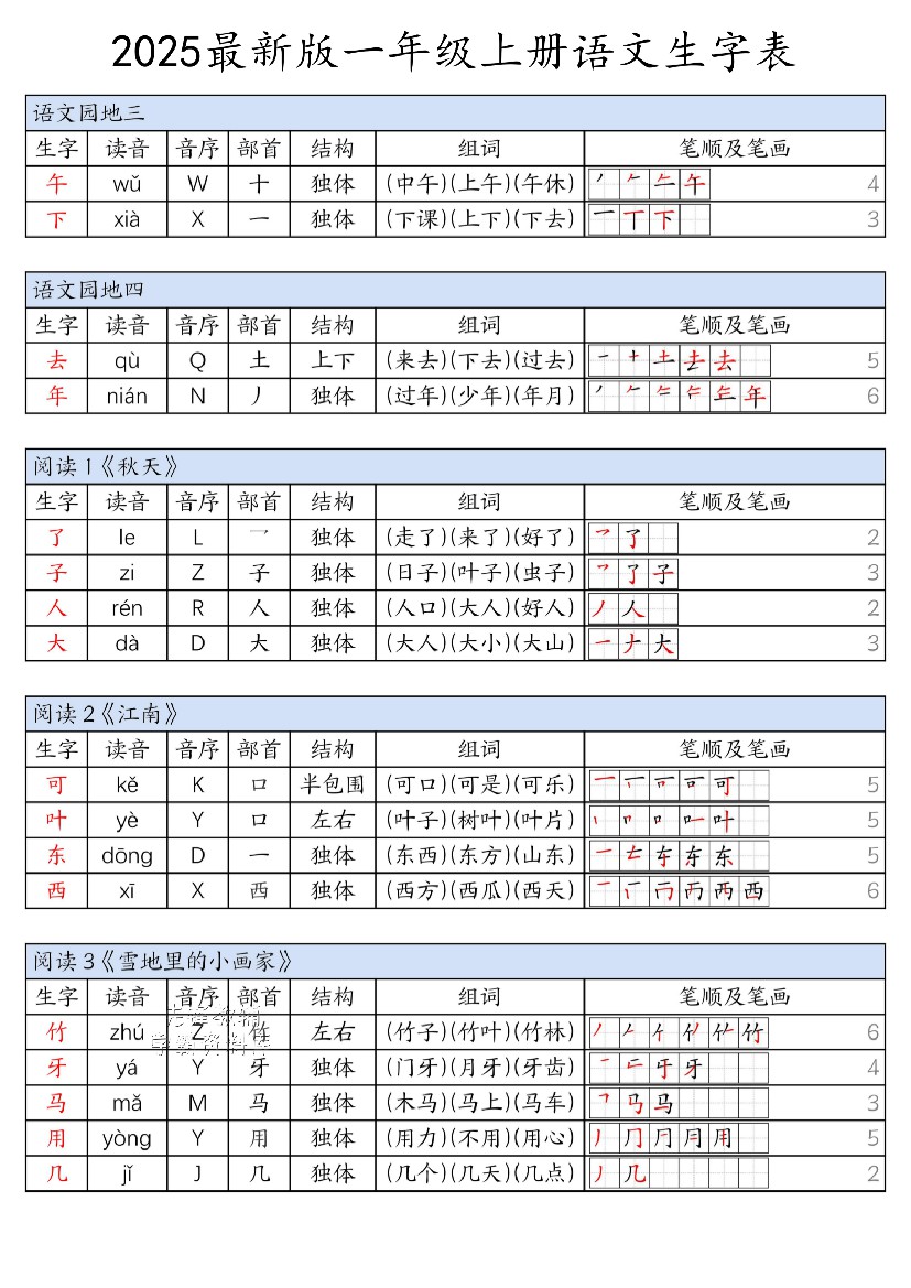 首页 > 全部 > 预习清单 > 一年级(上)语文上册生字表