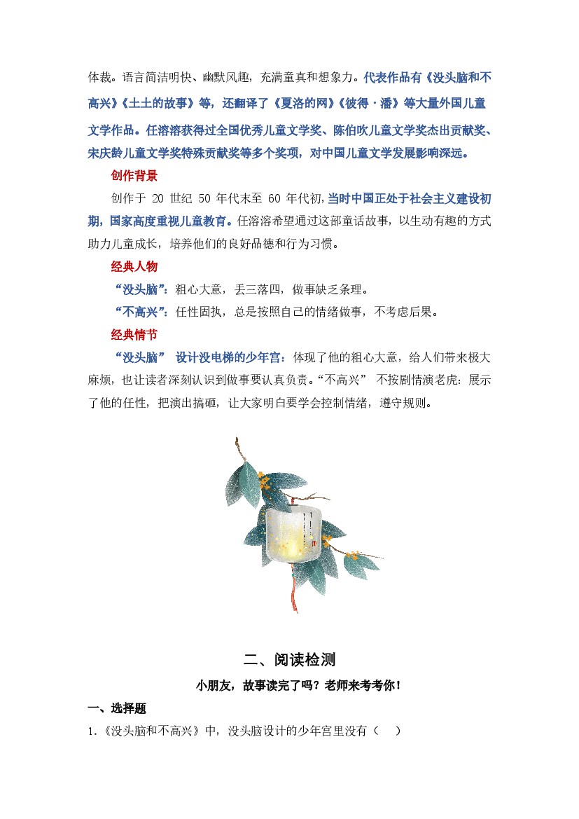 一年级(上)语文《没头脑和不高兴》知识梳理与阅读检测《统编版》