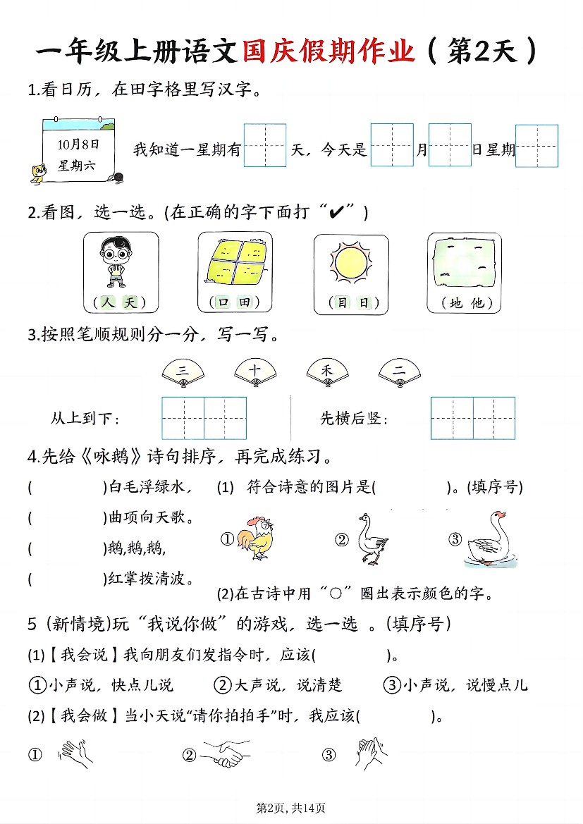 25秋一年级上册语文国庆假期作业7天(含答案14页)
