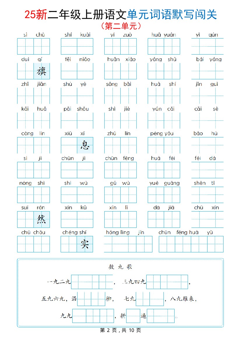 25新二年级上册语文《1-8单元词语默写闯关》(含答案10页)
