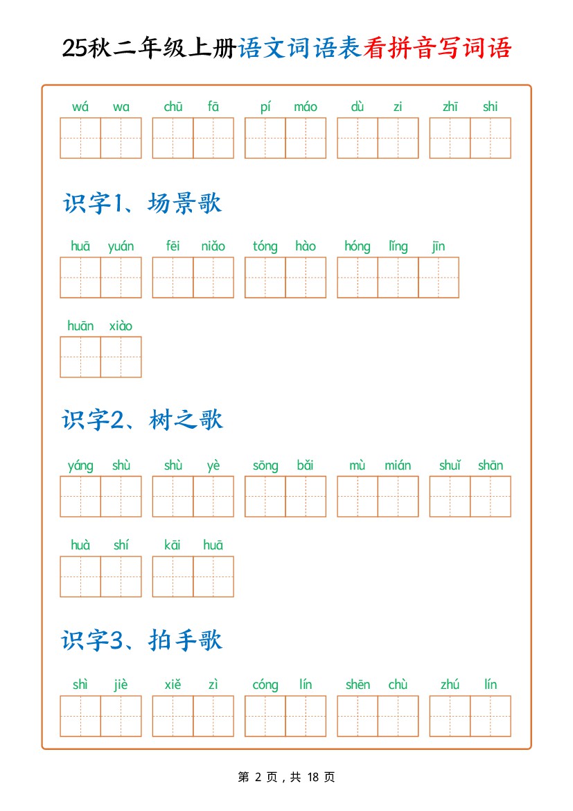 小学 二年级上册语文《词语表看拼音写词语》(含答案18页)