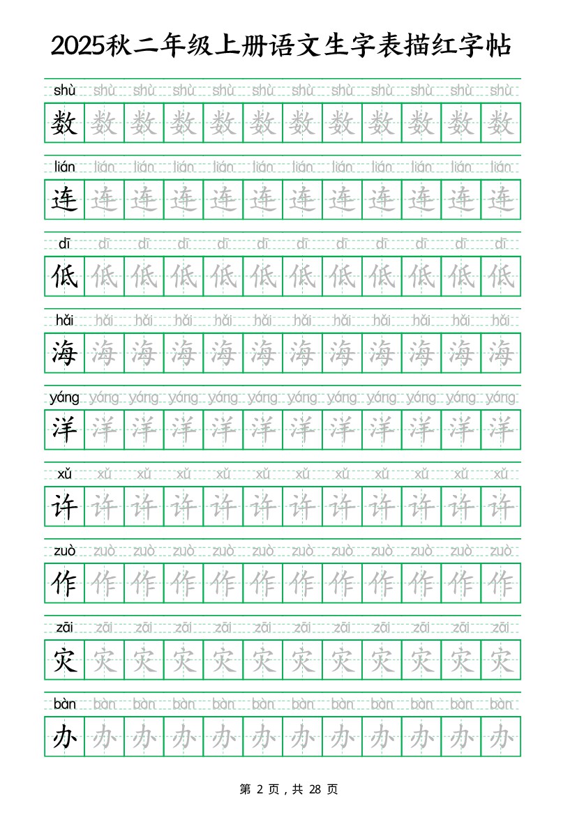 小学 【25秋新二上语文生字表生字拼音描红字帖(251字28页)