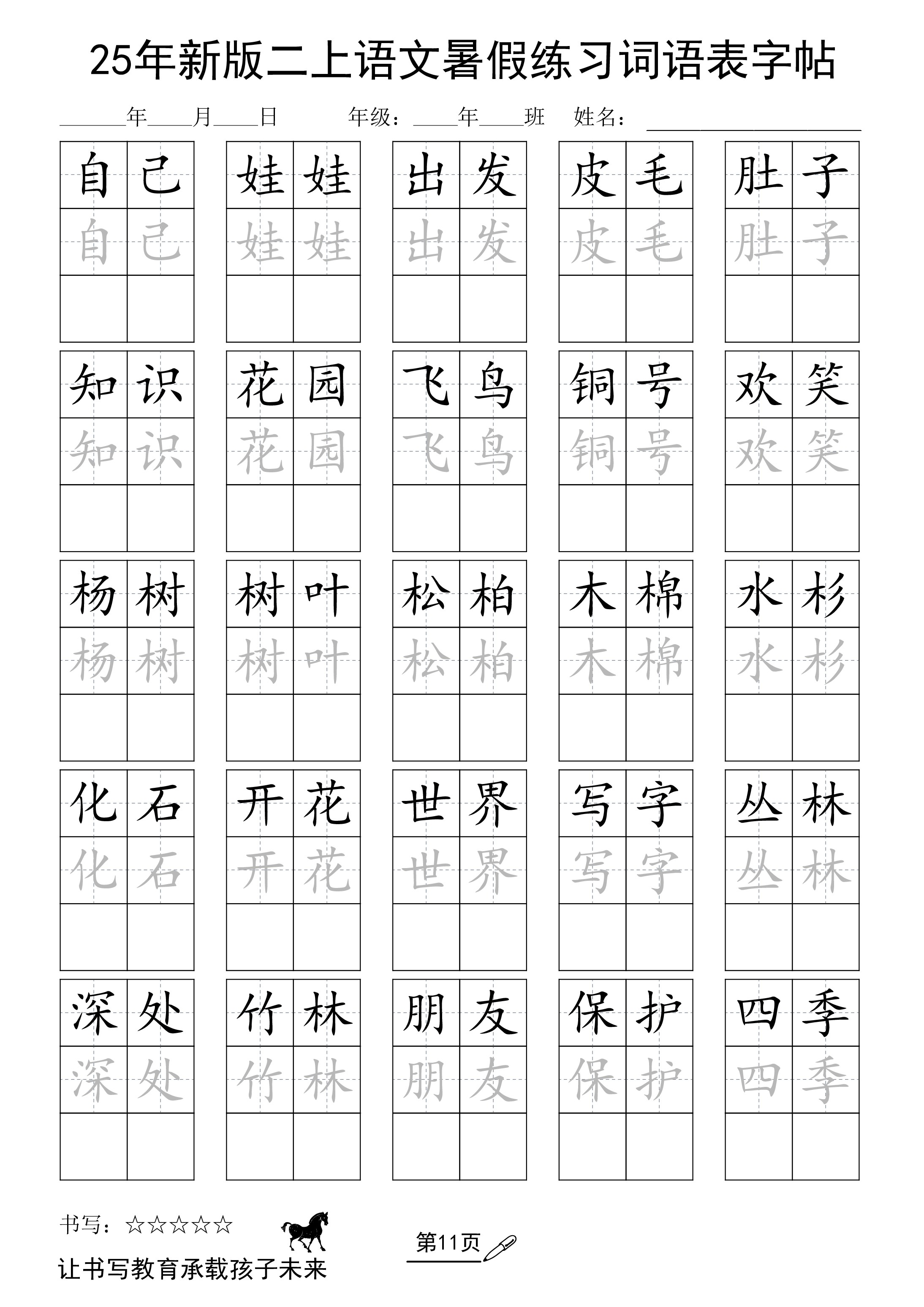首页 > 全部 > 假期练习 > 25年新版二上语文暑假练习词语表字帖