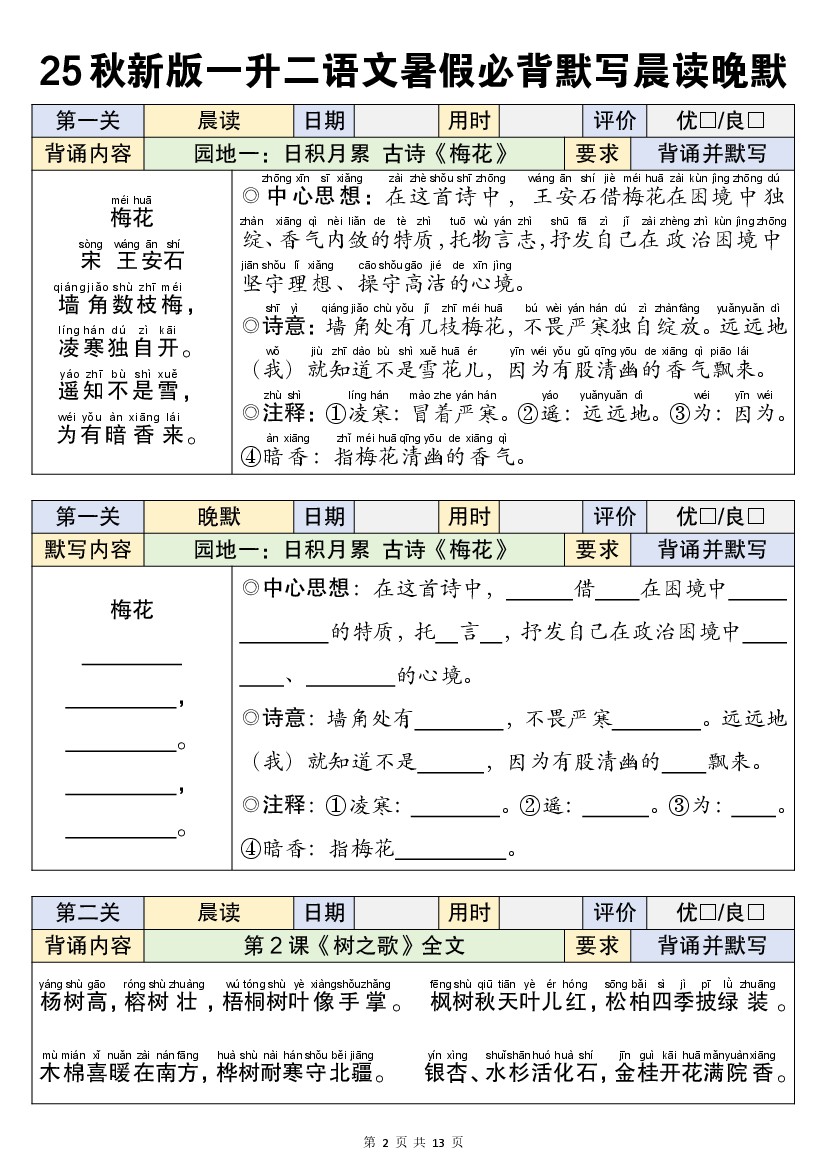 首页 > 全部 > 假期练习 > 25秋新一升二语文暑假衔接必背闯关表