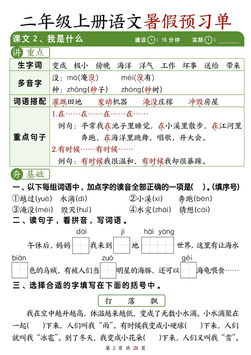 小学 二上语文暑假预习单(每课字词句重点+每课一练28页)