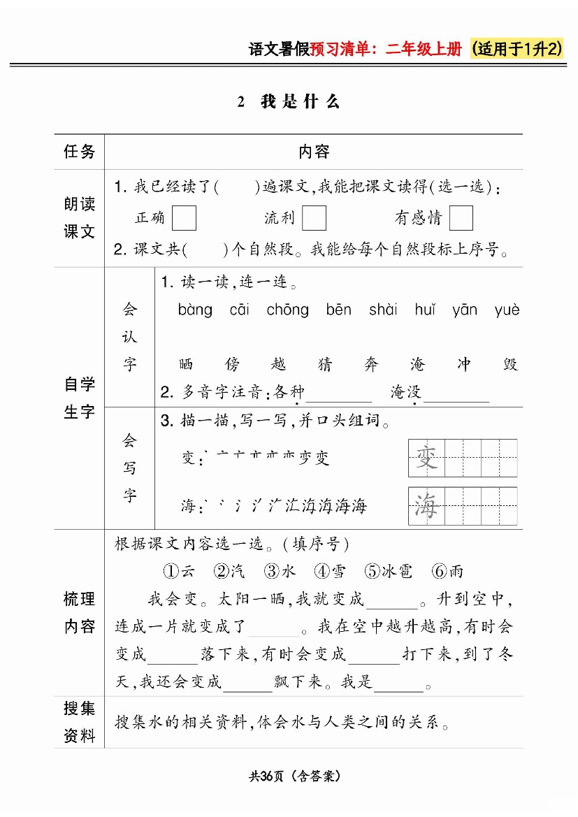 首页 > 全部 > 假期练习 > 一升二小学语文《暑假预习清单》最新版