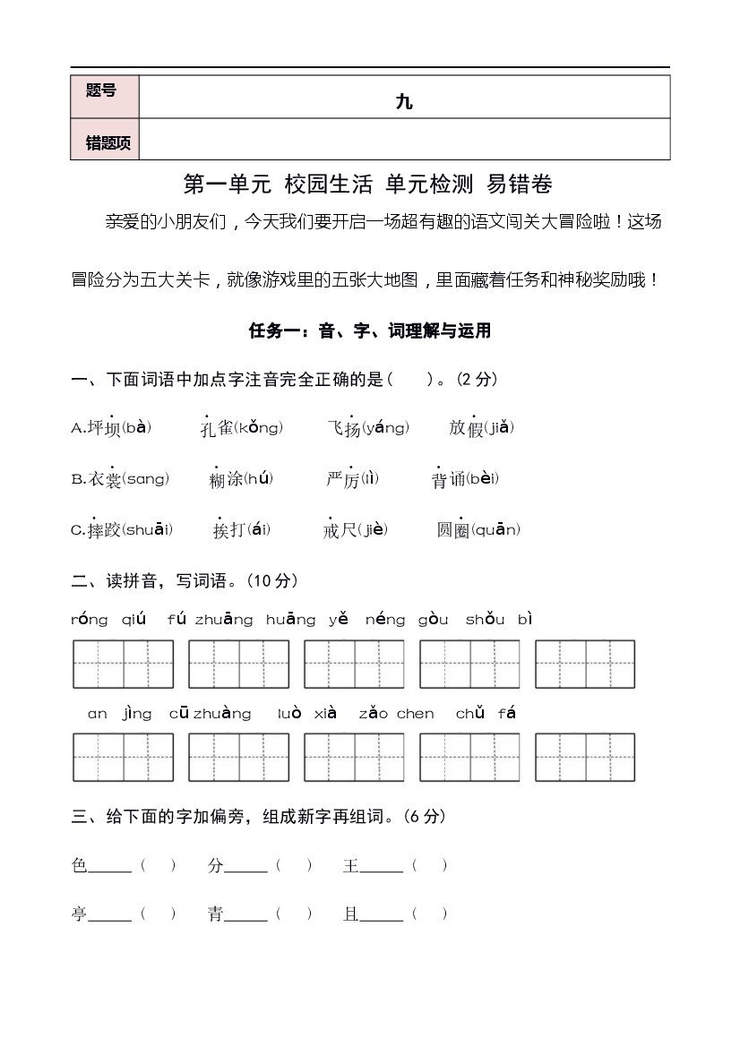 首页 > 全部 > 单元测试 > 25秋新三年级上册语文第一单元 校园生活(易错题)(新教材)