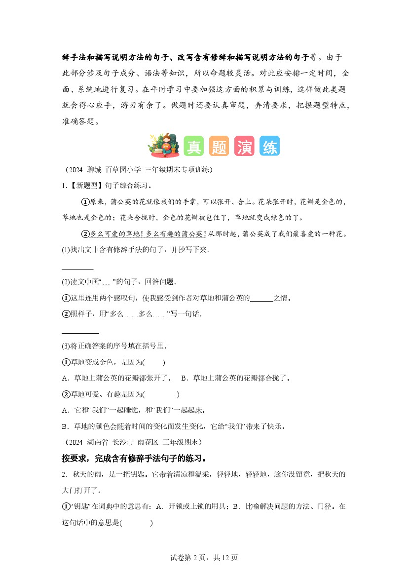 首页 > 全部 > 假期练习 > 专题05 修辞与描写和说明方法-2025年三年级语文寒假专项提升(统编版)