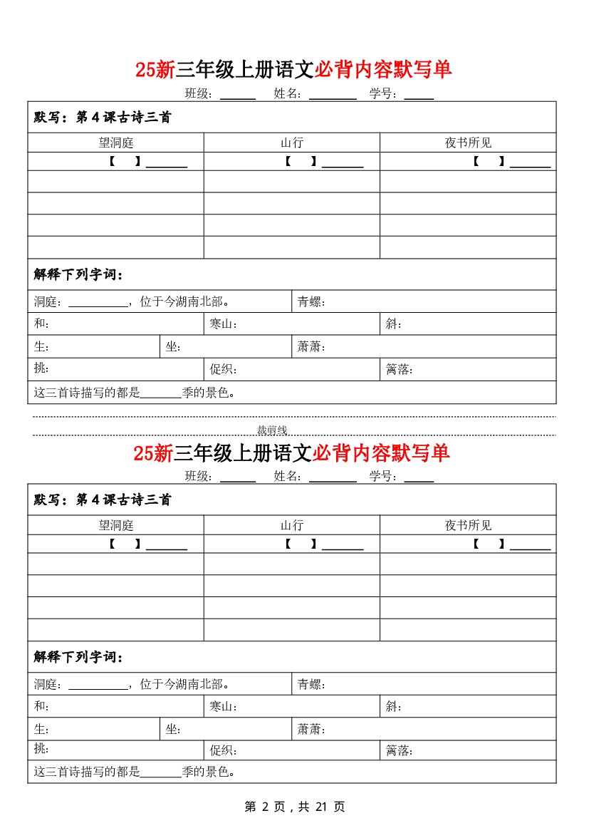 小学 25新三年级上册语文《必背内容默写单》(含答案21页)