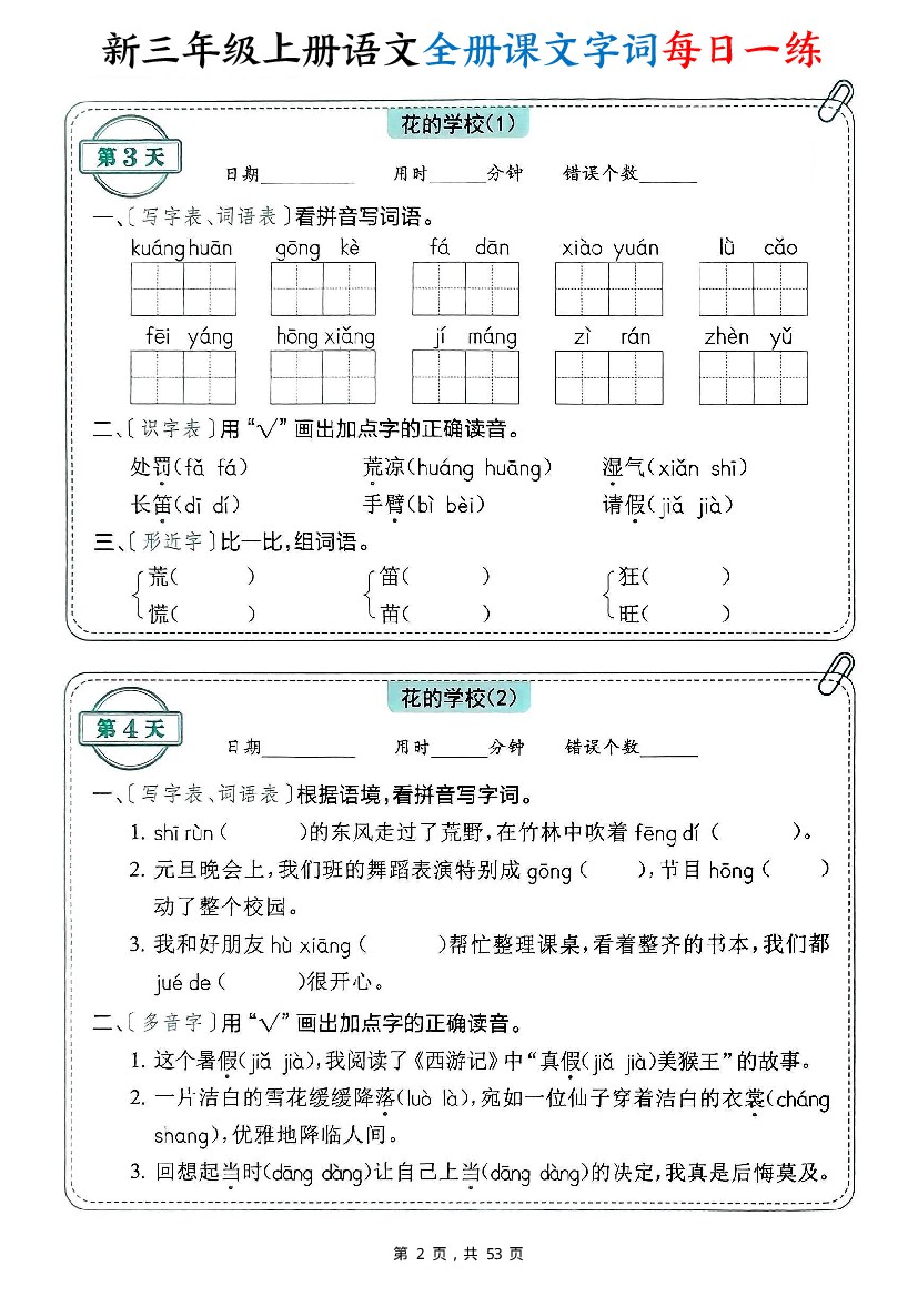 小学 新三上语文全册课文字词每日一练74天(含答案53页)