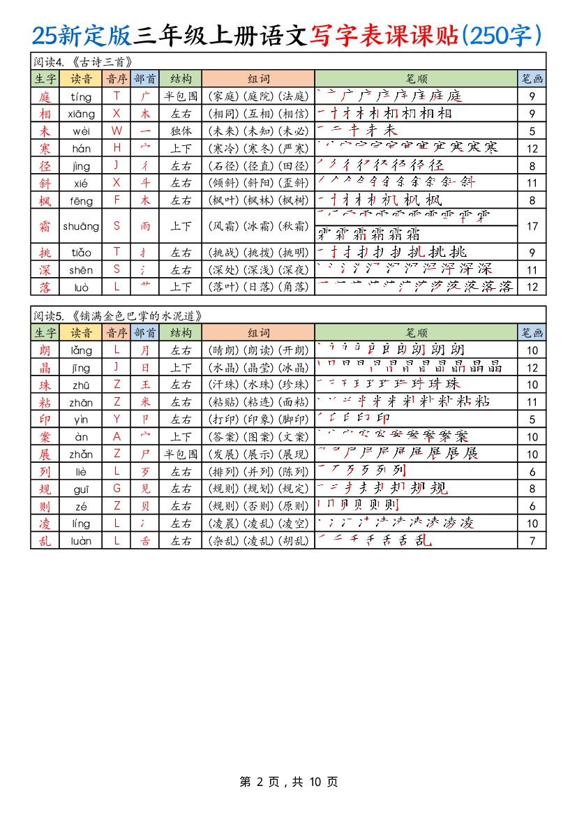 小学 25新定版三上语文写字表课课贴(250字)10页