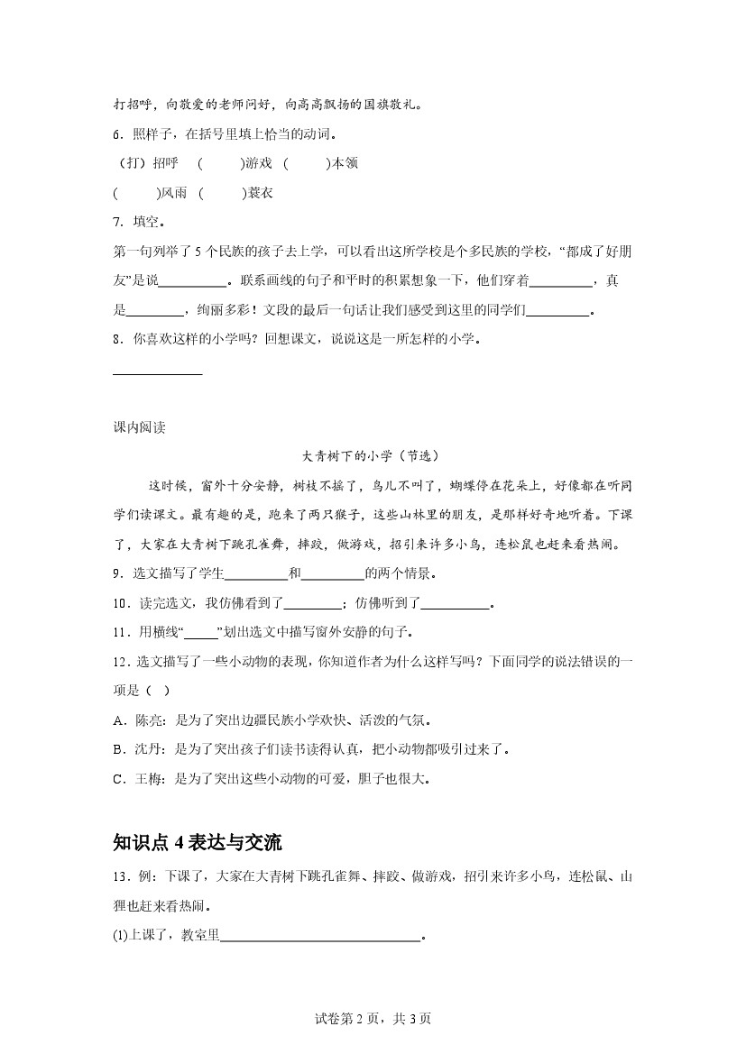 小学 25年秋【三上语文】第1课 大青树下的小学(第二课时)课后作业(基础)