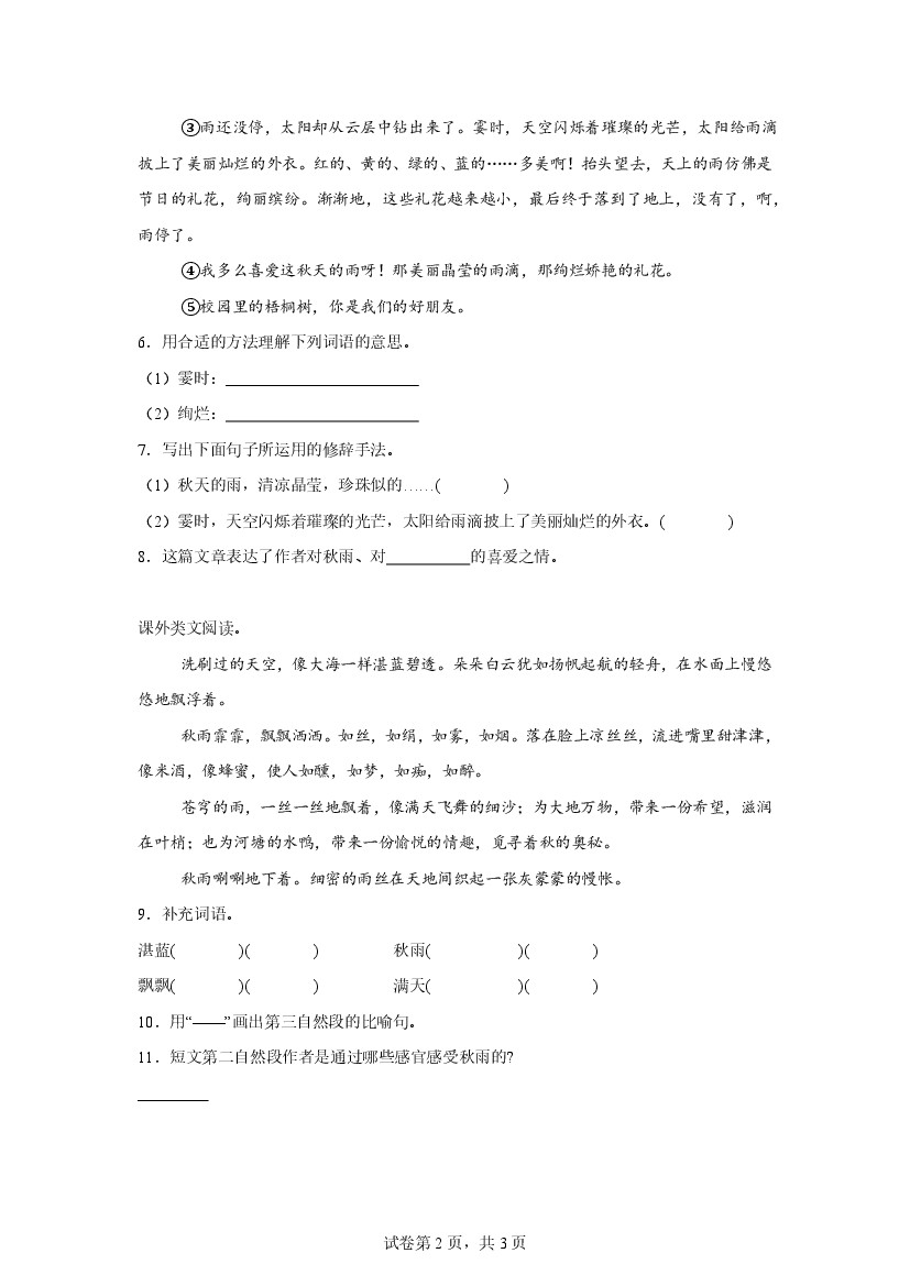 小学 25年秋【三上语文】第6课 秋天的雨(第二课时)课后作业(提升)